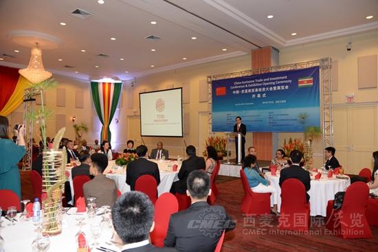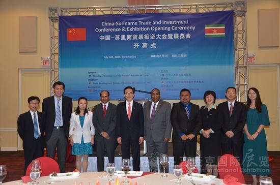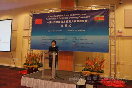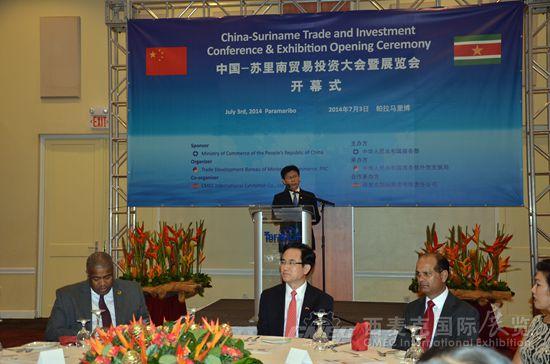 當(dāng)?shù)貢r間7月3日,由商務(wù)部主辦、外貿(mào)發(fā)展局和我司聯(lián)合承辦的中國-蘇里南貿(mào)易投資大會暨展覽會在皇家多娜麗嘉酒店舉行開幕式,駐蘇里南大使楊子剛、蘇貿(mào)工部長托森灸尤、工程部長帕梅薩和蘇中央銀行行長霍夫德拉德等蘇政府官員、中蘇企業(yè)代表、蘇僑界人士和蘇新聞媒體共120余人出席。