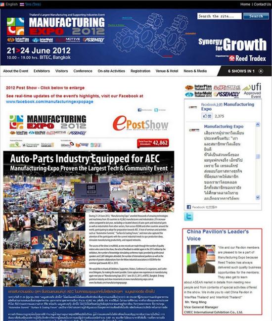 6月21日,我公司副總經(jīng)理楊明受邀參加了2012泰國國際機械制造展覽會開幕儀式,并代表我公司及整個中國展團接受了該展會官方的正式采訪,“我公司及整個中國展團很高興參加到勵展展覽集團為我們組織的這次高質量的國際商務合作機會中,我們將通過與新客戶的交流進一步了解東盟市場,歡迎并邀請各位到塑料館和模具館參觀中國展區(qū)。