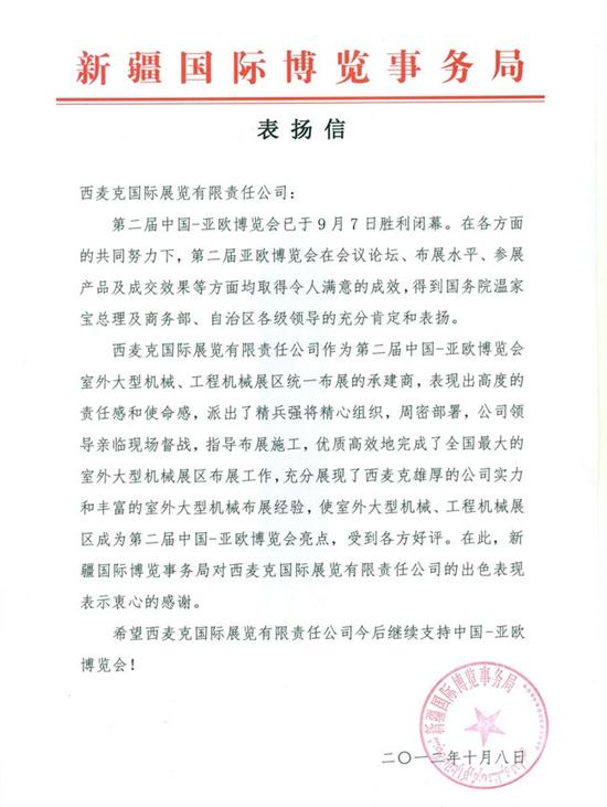 溫家寶總理在第二屆中國-亞歐博覽會開幕式演講中說道:“二十一世紀,是世界大發(fā)展、大變革、大調整的世紀,也必將是亞歐國家發(fā)展與合作大放異彩的世紀。”中國-亞歐博覽會的成功舉辦,將更好地發(fā)揮新疆東引西出、向西開放的地緣優(yōu)勢、推進和密切同亞歐各國關系、促進本地區(qū)和平、繁榮、穩(wěn)定和共同發(fā)展。承載著這份重要使命,西麥克人再次用卓越實力和奉獻精神向本屆博覽會遞交了一份完美的成績單;也正是這種責任感,給西麥克展覽的每一位成員注入了無窮的工作動力和熱情,推動著西麥克展覽公司穩(wěn)固、持續(xù)發(fā)展。